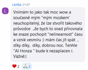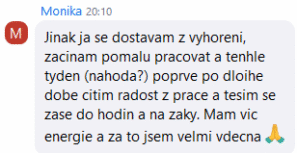 MONIKA: „Za necelé dva týdny jsme se dobrali ke kořenům mého vyhoření. Jsem teď schopná vnímat energie a přesně vidět, kde mi odtékají, co mě nabíjí a proč. Vidím svoje vzorce, které stály za tím, proč jsem vyhořela."