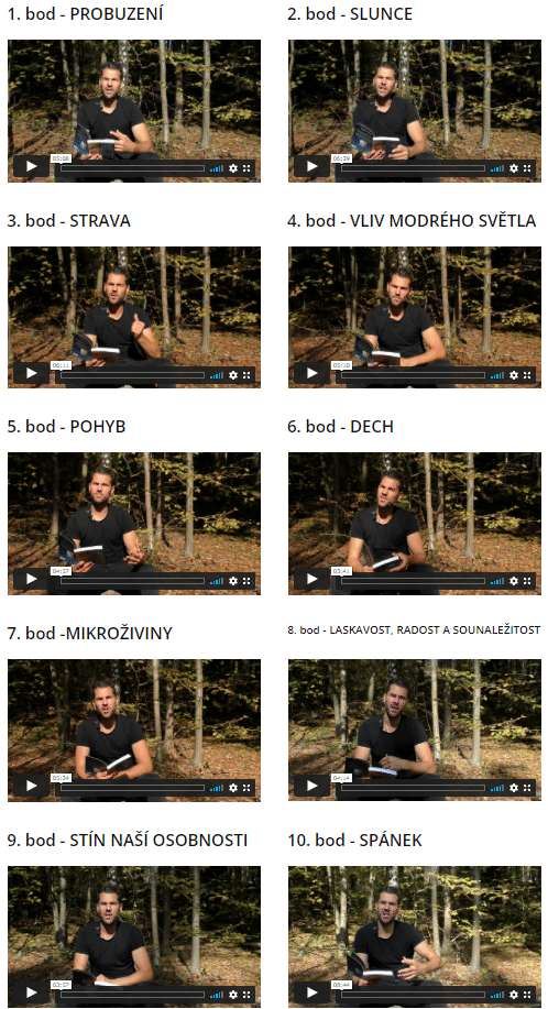 První bod je probuzení, druhý bod jsem dal slunce, třetí je strava. Čtvrtý je vliv modrého světla. Pátý je pohyb. Šestý je náš dech.