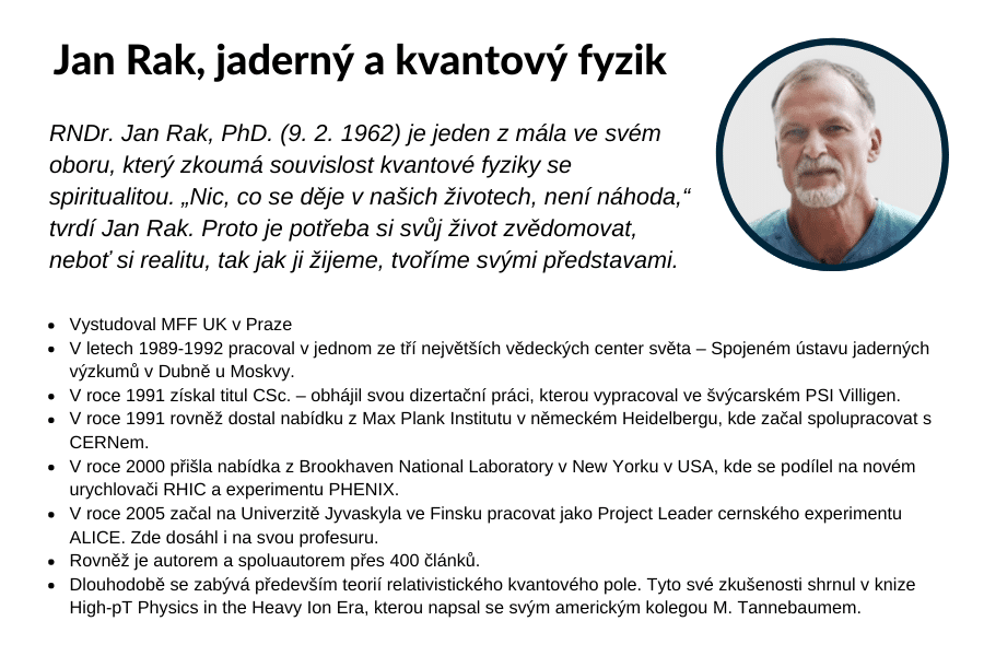 „Profesor Jan Rak ví. Ale co? Ví mnoho o fyzice, o životě, o povaze reality, o universálních principech, o důležitosti zdravého rozumu a také citu, o technologiích budoucnosti, které nám jsou ukrývány... Je toho mnoho. Honza Rak je člověk, který když mluví, tak nemusíte všemu rozumět a přesto něco hřejivého v sobě cítíte. Honza Rak nic netlačí, nepodsouvá, nehraje si na majitele pravdy a dogmat, jen nabízí vhledy k zamyšlení a navnímání. Je to člověk, se kterým chcete být a diskutovat a znovu jen být. Je to komplexní bytost nohama na zemi, s otevřenou myslí a srdcem. Co vám může jeho přítomnost dát? Všechno a nic. Záleží jen na vás.“