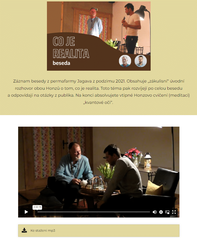 Záznam besedy z permafarmy Jagava z podzimu 2021. Obsahuje „zákulisní“ úvodní rozhovor obou Honzů o tom, co je realita. Toto téma pak rozvíjejí po celou besedu a odpovídají na otázky z publika. Na konci absolvujete vtipné Honzovo cvičení (meditaci) „kvantové oči“.