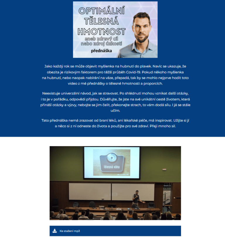 Záznam přednášky na téma optimální tělesné hmotnosti, aneb zdravý cíl, nebo zdroj úzkosti.