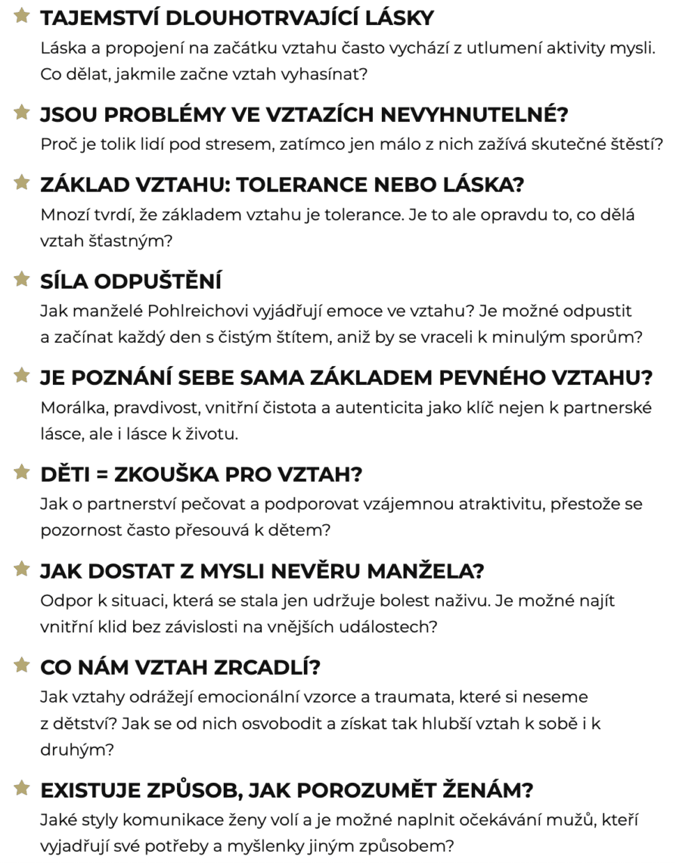 Beseda z cyklu Tvoříme Šťastnější Česko s Janem Vojáčkem, Martinem Jotovem, Janem Rakem a Zdeňkou a Zdeňkem Pohlreichovými o uvědomění, vhledech a konkrétních krocích ke ŠŤASTNÉMU MANŽELSTVÍ.