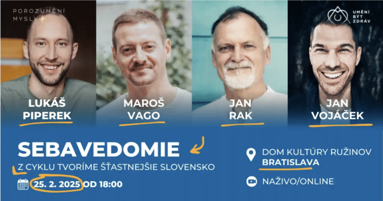Tato beseda navazuje na první událost z cyklu Tvoříme šťastnější Slovensko s názvem Od chaosu ke své síle, kde jsme se věnovali tématu sebehodnoty s Honzou Vojáčkem, Jozefem Banášem, Honzou Rakem, Martinem Jotovem a Lucií Ďuračovou.