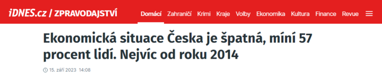 Podle výsledků nedávného průzkumu veřejného mínění vnímá ekonomickou situaci Česka jako špatnou 57 procent lidí. „Srovnatelné výsledky hodnocení lze najít až na počátku roku 2014,“ uvedlo Centrum pro výzkum veřejného mínění (CVVM).