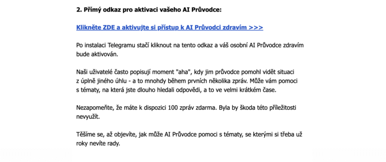 - 2PROKLIKNĚTE ODKAZ V E-MAILUVe vaší schránce si najděte e-mail s pozvánkou do zkušebního období nebo s potvrzením platby, ve kterém je aktivační odkaz, který vás přesměruje do Telegramu a aktivuje vám AI Průvodce Zdravím.