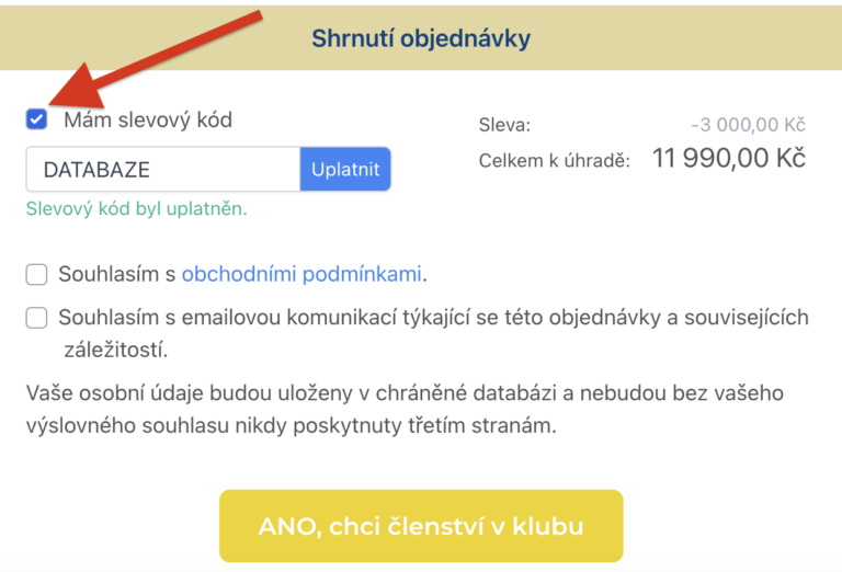 uplatnění vašeho slevového kódu v objednávkovém formuláři:
